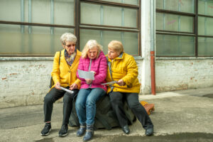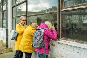 Neugierig erkunden Schröter, Kurzer und Plandowski das Grundstück, das früher ihr täglicher Arbeitsort war und tauschen dabei ihre Erinnerungen aus. Die Umrisse des Gebäudes sind dieselben geblieben, doch Fassade und vor allem das Innenleben sind für sie neu. Inzwischen hat ein Fitnessstudio hier nun seine Adresse. Die großen Fenster geben den Blick frei auf Hantelbänke, Stepper und Laufbänder. Die großen Reifen im Hinterhof sind Trainingsgeräte für den Outdoorbereich, dazwischen macht eine junge Frau gerade Übungen auf einer Fitnessmatte.
