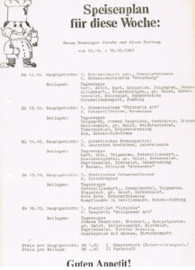 Für Vegetarier war das Mensaangebot Anfang der 80er Jahre noch mehr als bescheiden, wie dieser alte Speiseplan zeigt. Studierende hatten die Auswahl zwischen zwei Fleischmahlzeiten, dazu gab es verschiedene Beilagen, Salate und jeden Tag ein wechselndes Dessert. Heute bietet das Studierendenwerk Augsburg seinen Gästen in den Mensen und Cafeterien ein deutlich abwechslungsreicheres Angebot, natürlich auch an vielfältigen leckeren vegetarischen und veganen Gerichten. Am „Grünen Mittwoch“ wird in den Mensen beispielsweise nur mit pflanzlichen Zutaten gekocht.