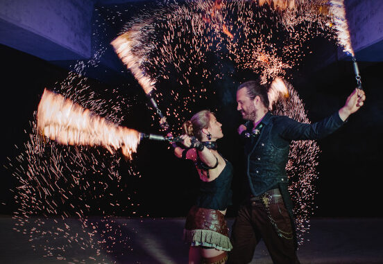Seit rund zehn Jahren sind Sara Lang und Fabian Geyrhalter als Fantômes de Flammes unterwegs, seit drei Jahren sind sie miteinander verheiratet. Denn zusammengefunden haben sie nicht nur beruflich, sondern auch privat. Neben ihren Feuerkunststücken hat sich das Künstlerduo auf Lichtshows mit LEDs und Schwarzlicht spezialisiert. Zum einen seien hier die Auflagen nicht so streng, zum anderen sei es deutlich besser für Klima und Umwelt. Hauptsächlich treten sie bei privaten Feiern wie Hochzeiten und Geburtstagen auf, hinzu kommen Buchungen von Unternehmen oder für öffentliche Veranstaltungen wie den Augsburger Sommernächten.