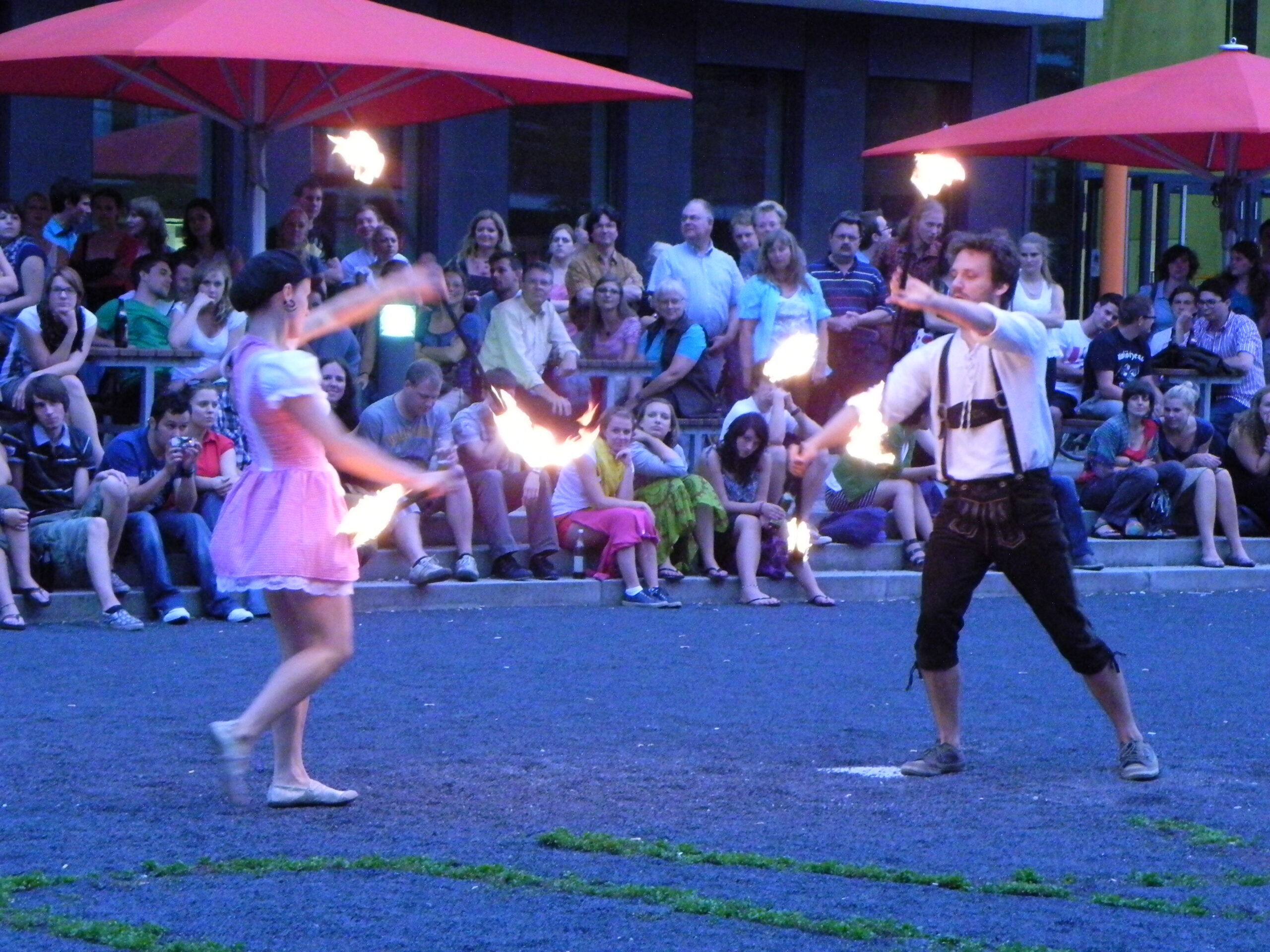 Ihr Auftritt bei der CampusKunst 2011 war einer der ersten. In Dirndl und Lederhosen ließen sie im Innenhof der Hochschule Augsburg Feuerseile Funken sprühen. Kurz zuvor hatten sich die beiden auf einer Party an der Uni kennengelernt. Sara Lang studierte damals noch Jura, Fabian Geyrhalter Mathematik. Sie hatte damals schon Gefallen gefunden an Akrobatik kombiniert mit Feuerkunst, er wollte vielmehr ihr gefallen. Gemeinsam mit einer Gruppe anderer Studierender trainierten sie, immer auf der Suche nach neuen Auftrittsmöglichkeiten.